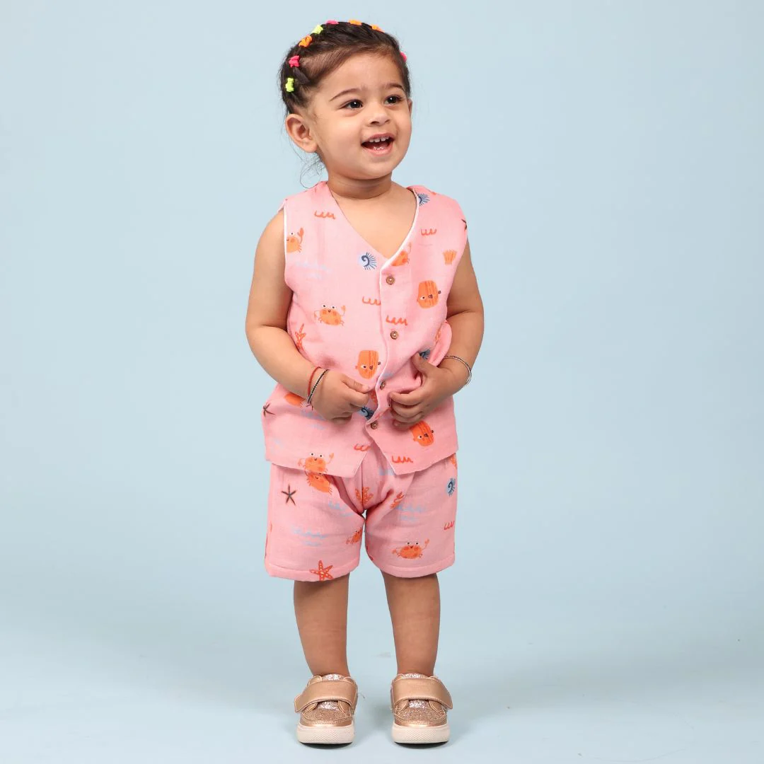 Let your little one crawl in comfort with our Crabs Muslin Jhabla Top with Shorts—made from ultra-soft muslin cotton and finished with playful crab prints for breezy summer days.