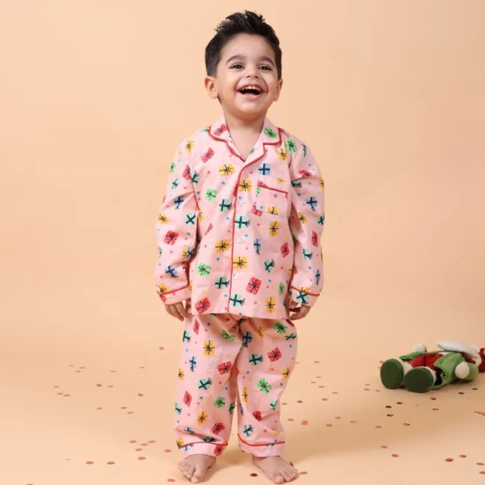 Celebrate bedtime with our Gifts Gallore Full Sleeves Night Suit—crafted from soft cotton and decorated with fun gift box prints for cozy nights and cheerful dreams.