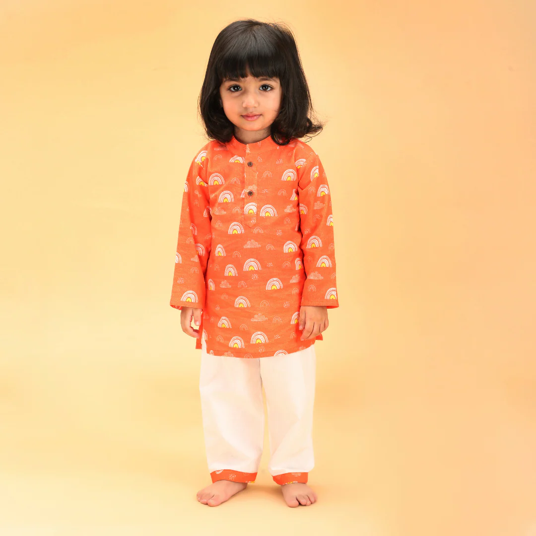 Brighten up your child’s day with our Orange Rainbows Cotton Kurta Set—crafted in soft cotton with cheerful rainbow prints and a breezy fit for all-day play and comfort.